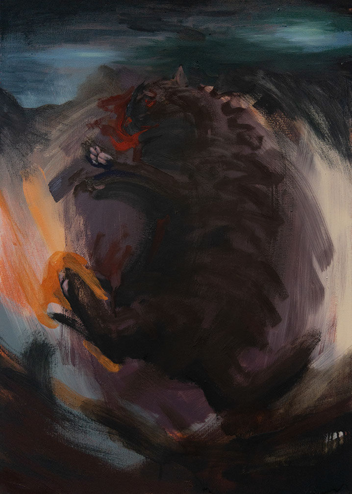 Rough and dry brush strokes were laid to capture the grittiness of my topic. The edges of my animals fade into their surroundings, showing how their bodies decay and become lost into the earth. The color harmonies are cold, with moments of browns and reds to evoke rotting flesh and blood. Three paintings are presented in the format of a biblical triptych in order to inspire spiritual contemplation, while the rest of the works offer more ways to look at death.